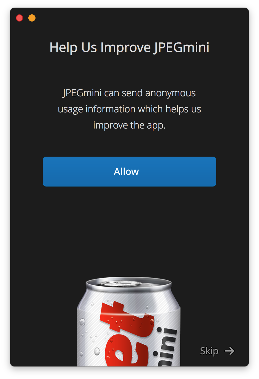 「JPEGminiアプリの改善に役立つ匿名の使用情報の送信」を許可するなら「Allow」、