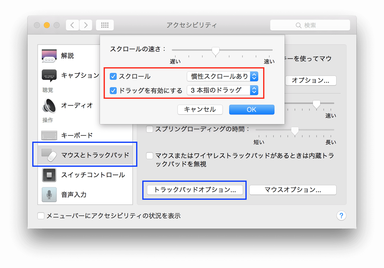 スクロールして [マウスとトラックパッド]をクリック後、[トラックパッドオプション] をクリックすると、「ドラッグを有効にする」機能にて「3本指のドラッグ」が選べます。