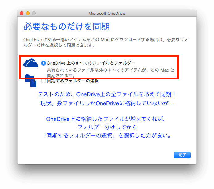 自宅の Mac mini は CATVインターネット に有線で接続されていますので、 テストも兼ねて OneDrive 上の全ファイルを同期する設定としました。