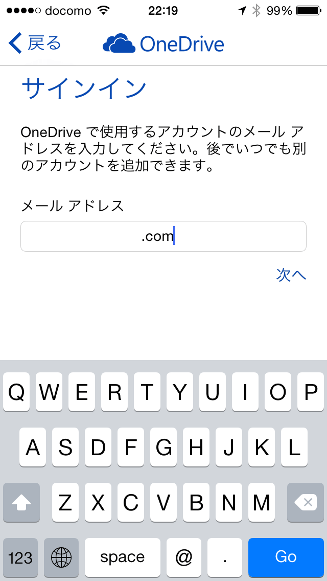 Microsoft アカウントのメールアドレスを入力し、「次へ」をタップ。