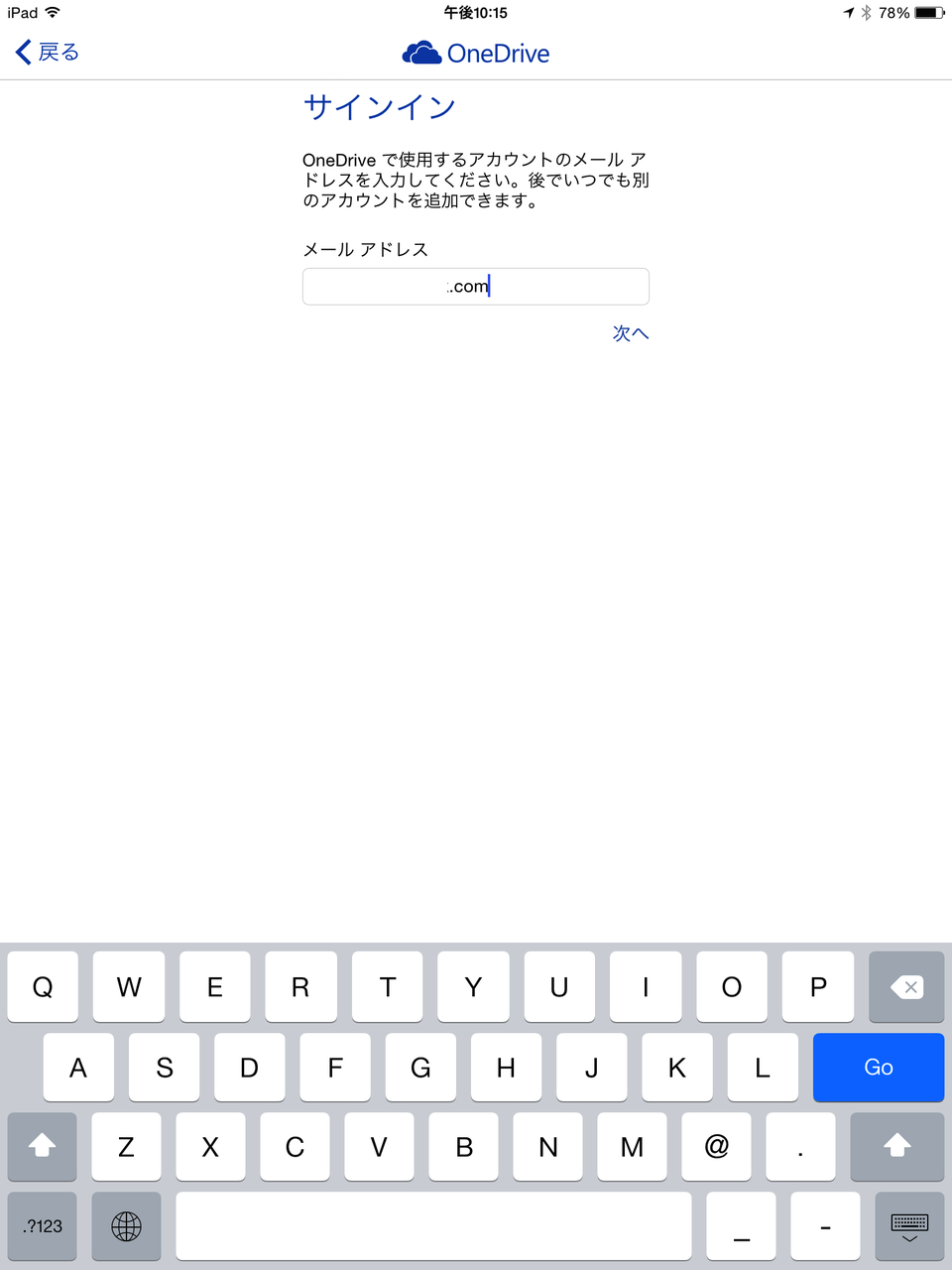 Microsoft アカウントのメールアドレスを入力し、「次へ」をタップ。