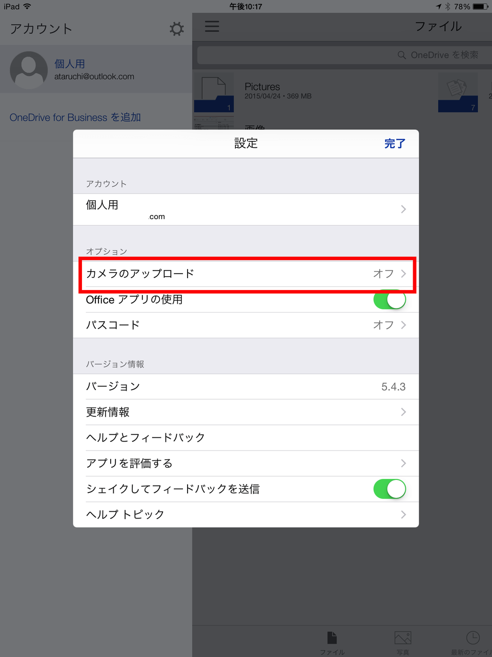 タブレットではあまり撮影をしないため、カメラのアップロードはオフとした。