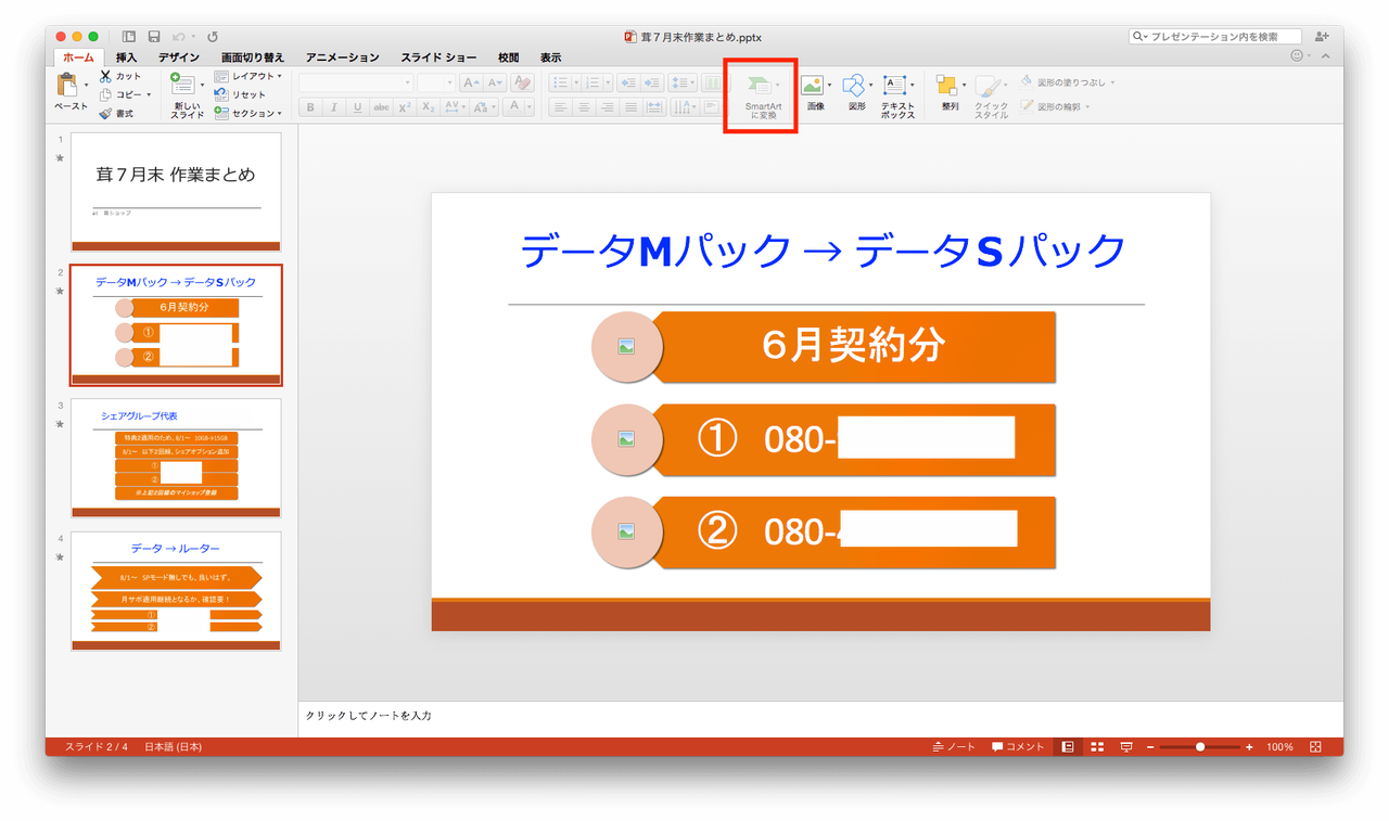 「SmartArt」はスライド内にテキスト(複数行)を貼り付けておいてから、一気に適用できるようになったのですね。