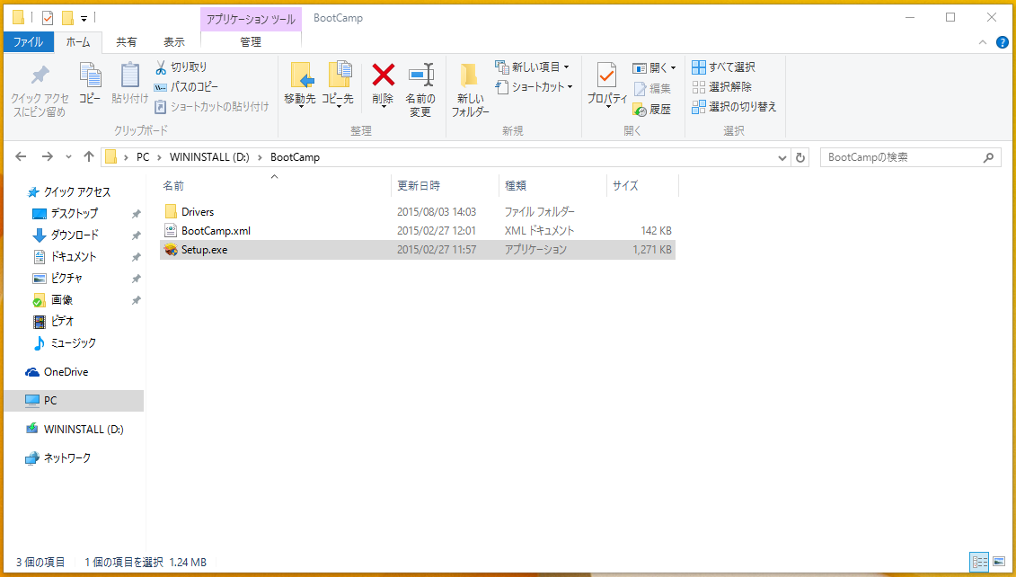 USBメモリ直下の「setup.exe」ではなく、「BootCamp」フォルダ内の「setup.exe」をダブルクリックして BootCamp ドライバの更新のみを行います。