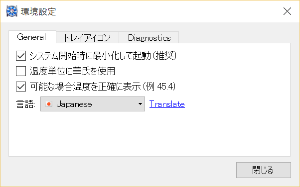タスクバーのアイコンを右クリック後「環境設定」を選択すると、下記画面を表示します。