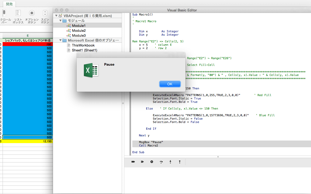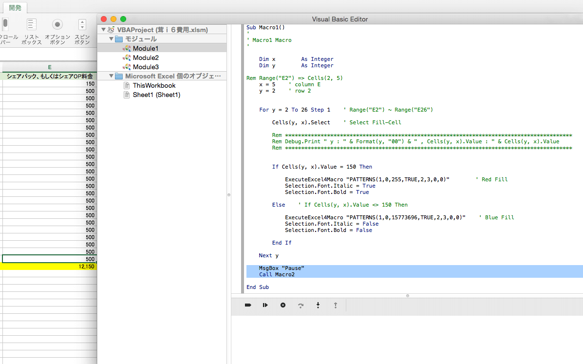 この実験結果から関数(Function)の追加こそできないが、機能単位にマクロのコードを変更し、「メインのマクロ」から「サブのマクロ」を次々と呼び出す形にすれば、けっこう色々なことが出来そうですね。