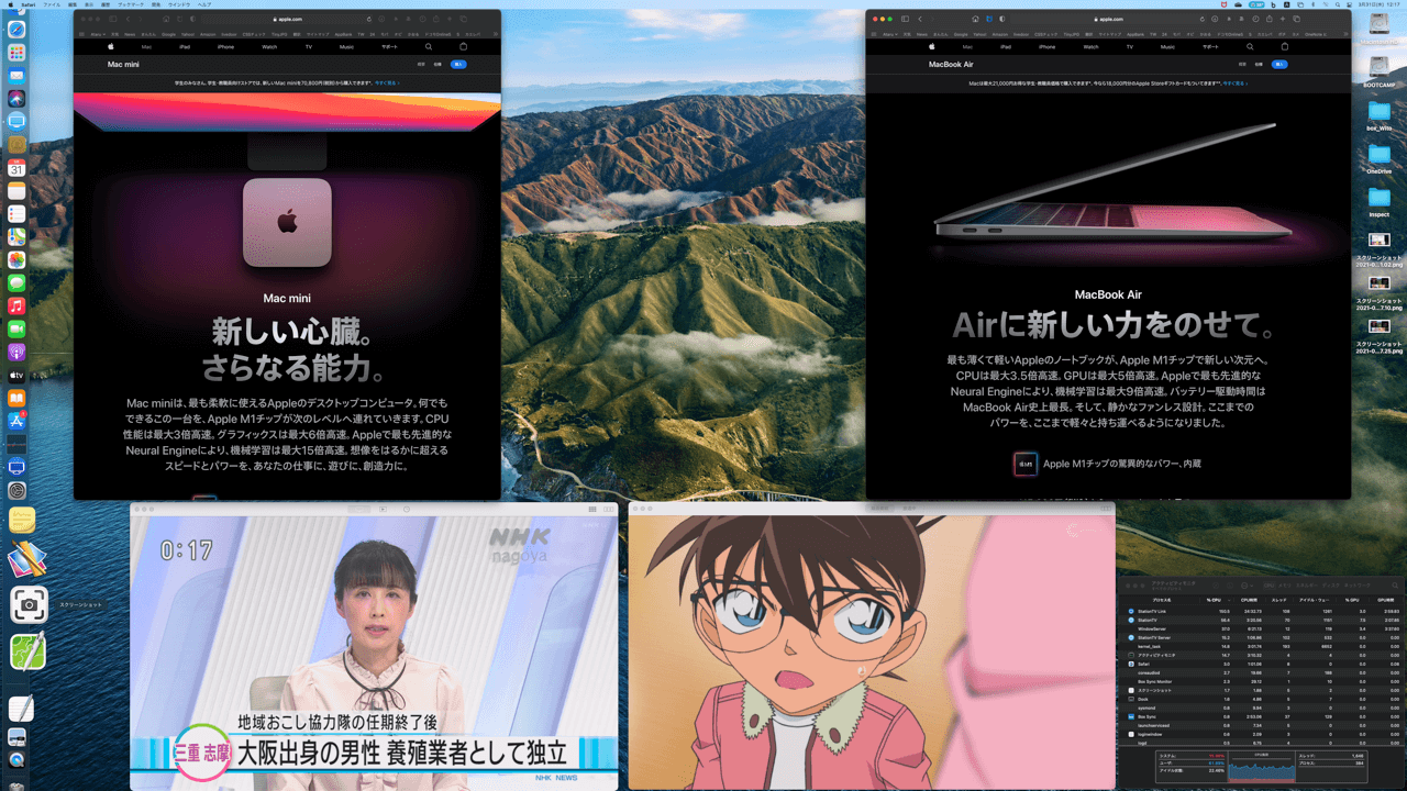 具体的には、上記 4K 画面のように 15インチ相当の 2つの動画( Mac用 USBテレビチューナー + Diga の録画番組再生 )を見ているときに、( 3画面を同時に開く) Safari ブラウザを新たに起動すると、3画面分のブラウザデータを受信するまで 数秒ほど コマ落ち しますが、アプリが落ちたことはありません。 参考として、速度が 2ギガ契約 の 光回線 を利用していて、 Finder と テキストエディタ 以外のアプリは同時起動していません。 Mac用 USBテレビチューナー アプリ( BigSur 対応を確認済み )はネット負荷はありませんが、 CPUの負荷 が割と大きいですね。 音声もあるので、(通常、)動画は複数同時に見ませんが...(笑)