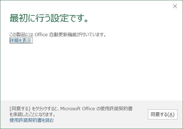 最初に起動した Office2016 アプリで、上記のダイアログ画面が表示されるようです。