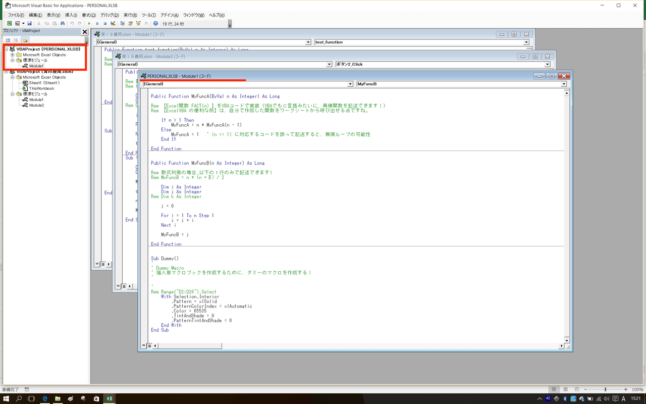 ローカルPCに保存されている「PERSONAL.XLSB」のVBAコードも表示され、 再コンパイル後にVBAコードが動くかどうか試しました。
