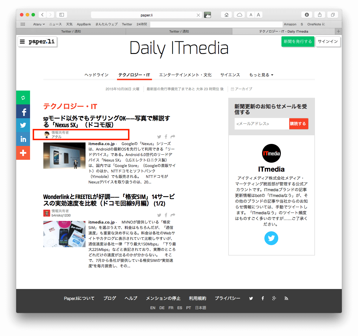 【ITmedia Mobile】spモード以外でもテザリングOK――写真で解説する「Nexus 5X」(ドコモ版)ITmedia さんの Paper.li は「 Daily ITmedia 」で、トップページに筆者の Twitter ID が表示されてる!
