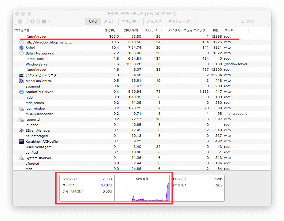 (1) CPU使用率異常で「アイドル状態が」0%に近づくと、結果的にハング状態となる。 (2) OS X El Capitan 、「ハング・CPU使用率異常」の不具合は「ウイルスソフト終了」で回避できる場合が多い!