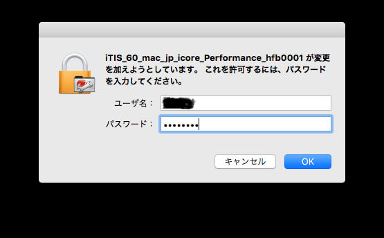「 ウイルスバスター for Mac 6.0 」のモジュールの一部を変更するため、パスワードを入力し、 [OK] を選択。
