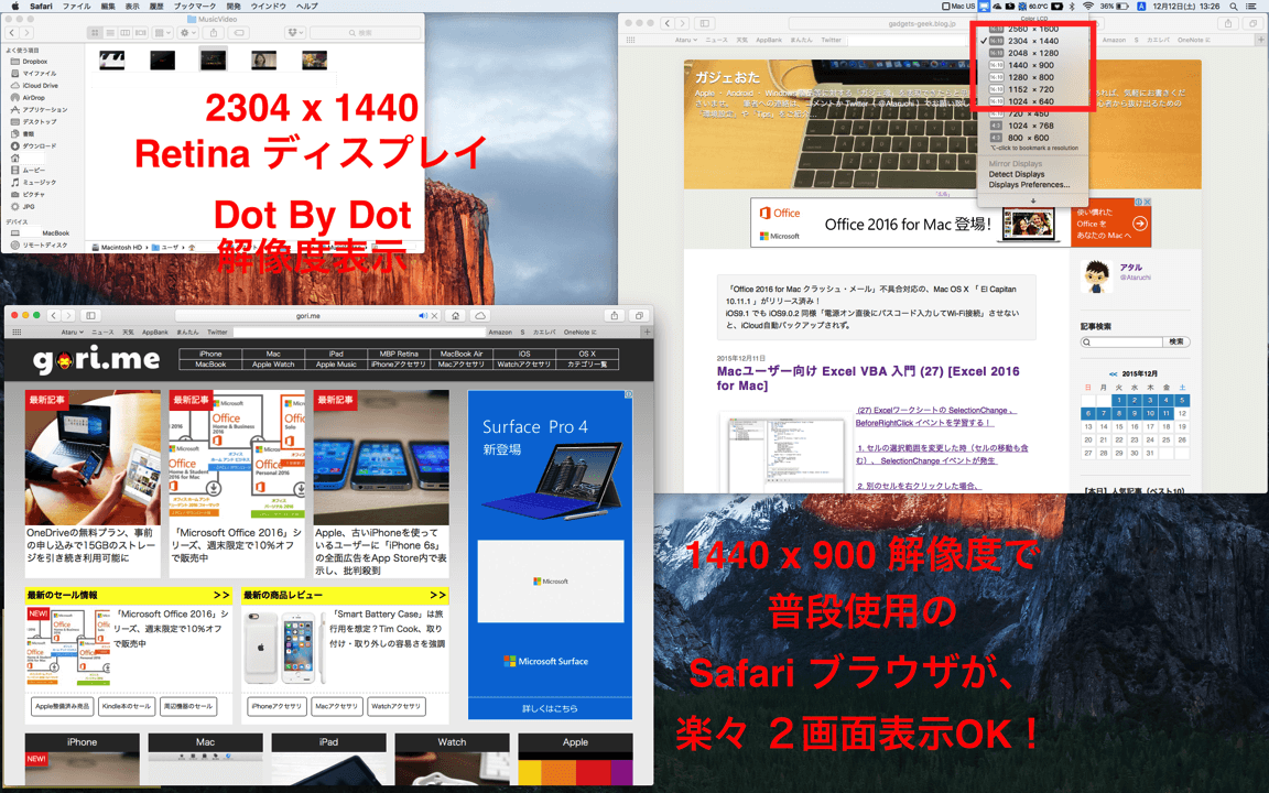 筆者は「システム環境設定」から選択可能な最高解像度で普段使用しているが、 Retina ディスプレイ本来の解像度で通常使用可能か試してみた!