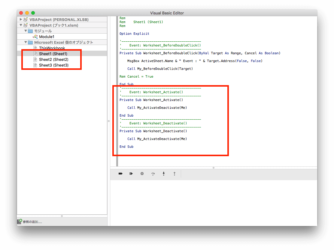 筆者の場合だと Sheet1 , Sheet2 , Sheet3 の3モジュール。(緑色の部分はコメントのため、省略可)