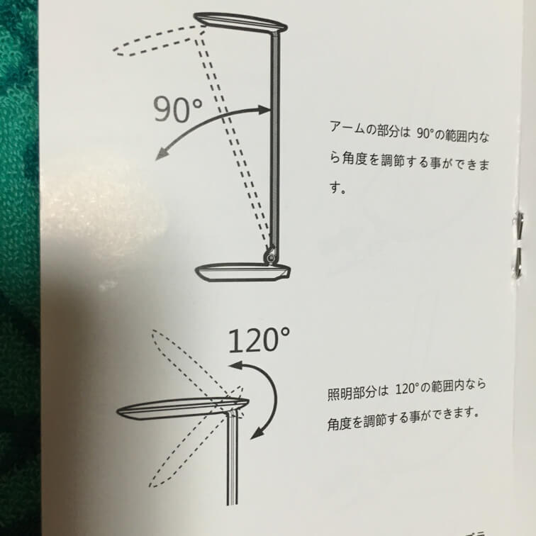 アーム部分の可倒範囲は 90 〜 0度、セード(照明部分)の可倒範囲は 120度( 120 〜 0度 )水平状態から前後60度ずつ 。