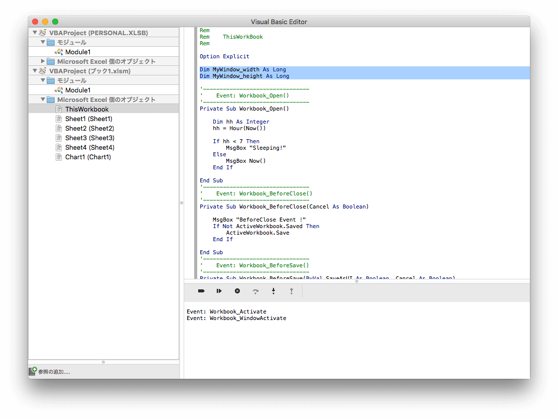 前回追加した Workbook_WindowActivate プロシージャの先頭に、現状のウィンドウサイズを保存するピンクの2行を追加する。