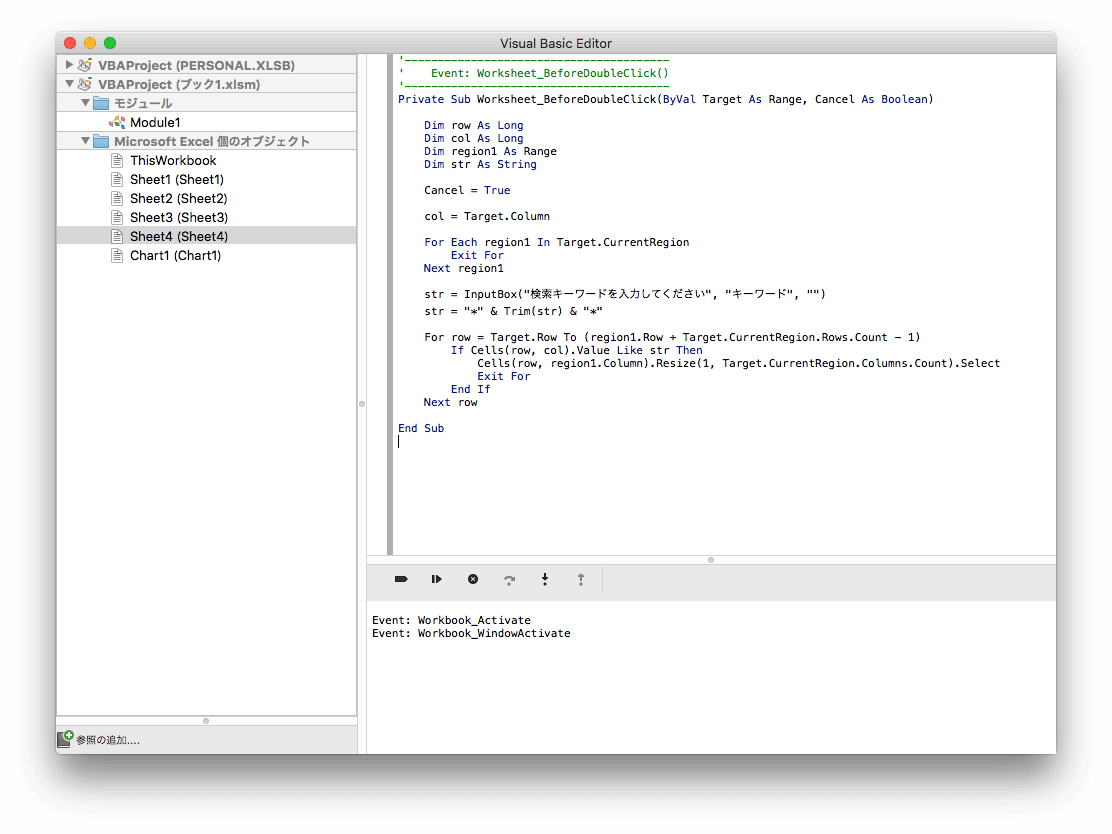 行方向(行を上から下)に検索したい「列」を含むセルをダブルクリックすると、「キーワード」入力のための InputBox が開く。