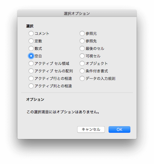 1.「ジャンプ」ダイアログで [セル選択…] をクリック後、「選択オプション」ダイアログを表示
