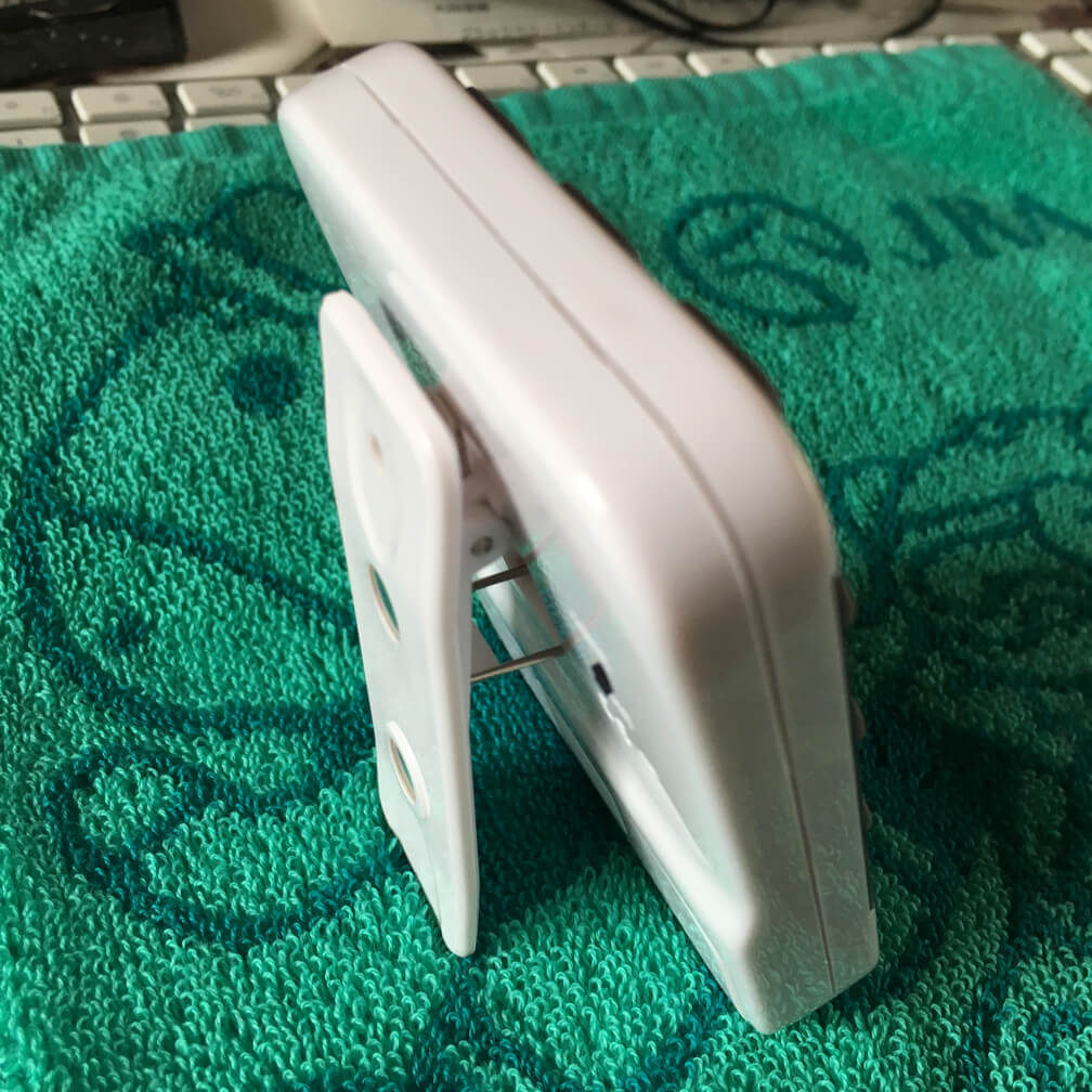 スタンド利用時以外は、「裏の磁石」、あるいは「裏のクリップ」で何かに挟んで固定する。