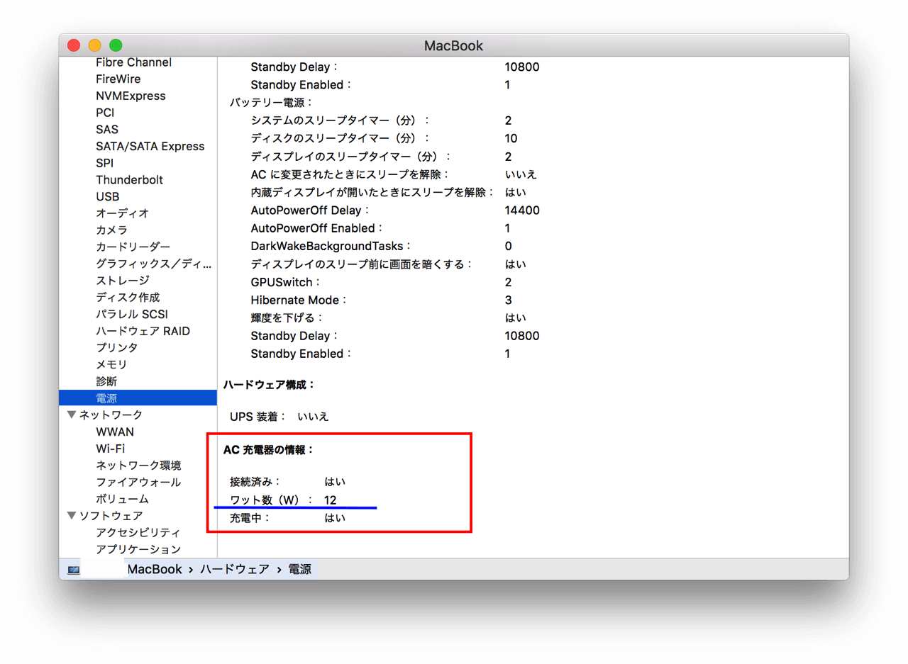 また、12W (5V2.4A) / 15W (5V3A) 対応ケーブルかどうかは、Macの [システム情報] - [電源] にて 一番下に、 12W あるいは 15W と充電時に表示されることが判明した。