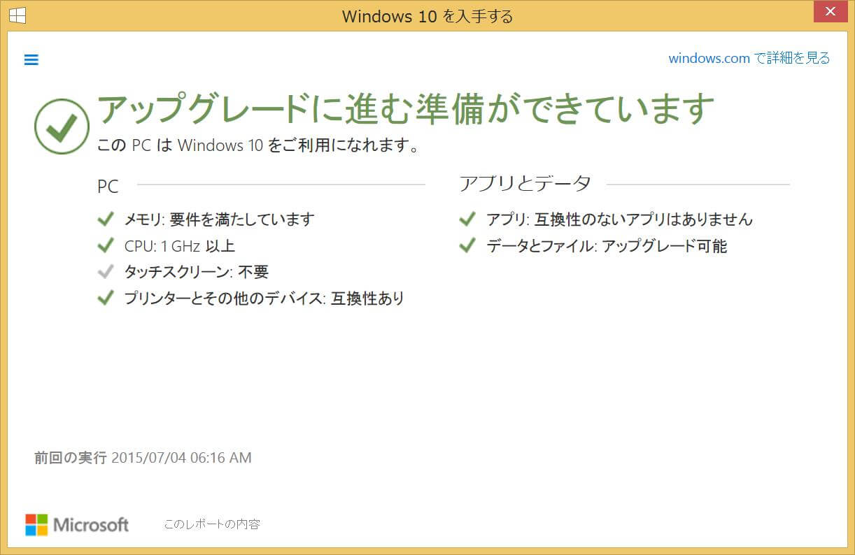 ・[Get Windows 10]アプリから[PCのチェック]を実行しておくと安心とのことなので、実行!